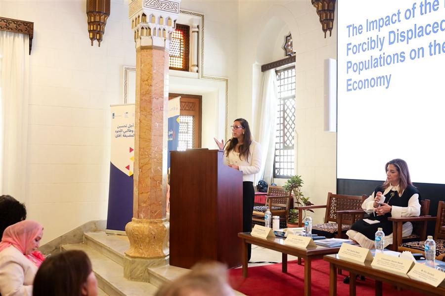 ومن جانبها استعرضت الدكتورة دينا عبد الفتاح الأستاذة المساعدة ورئيسة قسم محمد شفيق جبر للاقتصاد بكلية أنسي ساويرس لإدارة الأعمال بالجامعة الأمريكية الدراسة التي أجرتها الجامعة الأمريكية بالقاهرة ومنظمة العمل الدولية حول تأثير تدفق المهاجرين قسريًا على الاقتصاد المصري حيث أكدت عبد الفتاح أن هذه الدراسة ستكون أساس للعديد من الدراسات المقبلة في هذا المجال إذ مرت مصر منذ عام 2011 بالعديد من الأزمات الاقتصادية، بينما قامت مصر بعد ذلك وتحديدا في عام 2014 بالعديد من الإصلاحات الاقتصادية ثم بدأت في تحسين الموقف الاقتصادي لها، لكن تواجه في ذات الوقت العديد من التحديات حيث تواجه عدد ضخم من اللاجئين.