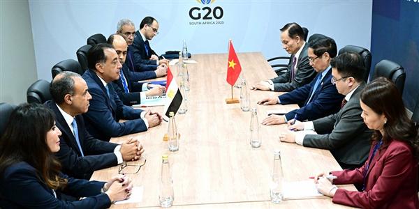 التقى الدكتور مصطفى مدبولي، رئيس مجلس الوزراء، بـ فام مينه تشين، رئيس وزراء فيتنام، بحضور الدكتور بدر عبد العاطي، وزير الخارجية والهجرة وشئون المصريين بالخارج، والسفير أحمد علي شريف، سفير مصر لدى جنوب أفريقيا، على هامش مشاركته في قمة مجموعة العشرين (G20) لعام 2025 بمدينة جوهانسبرج بجنوب أفريقيا.
