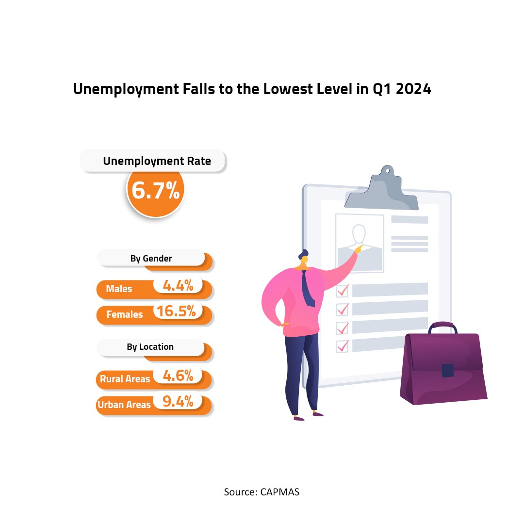 The unemployment rate in Egypt declined to 6.7% in the first quarter (Q1) of 2024 from 6.9% in the last quarter of 2023, according to data from the Egyptian Central Agency for Public Mobilization and Statistics (CAPMAS).